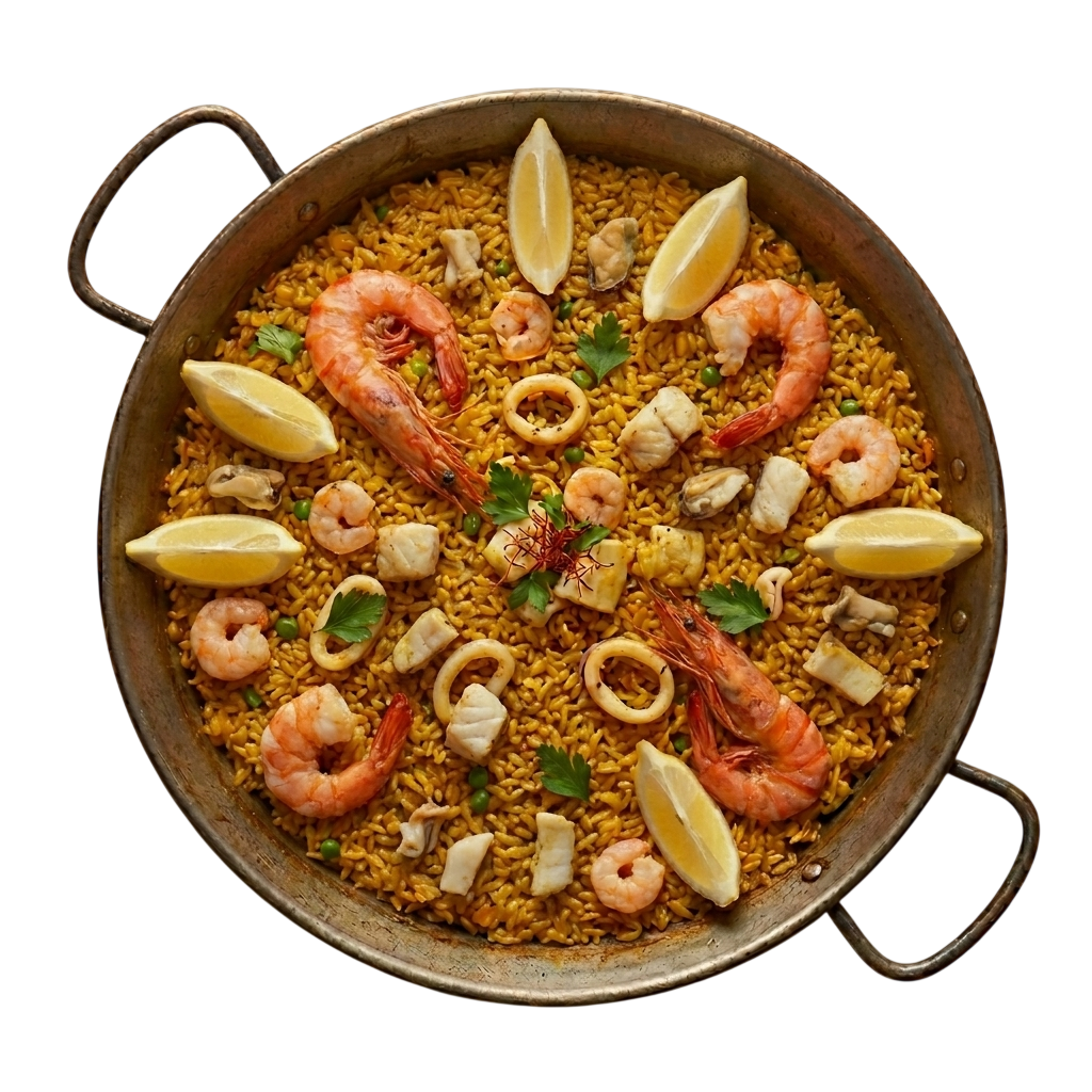 Calamar, gambón, sepia y caldo de pescado.